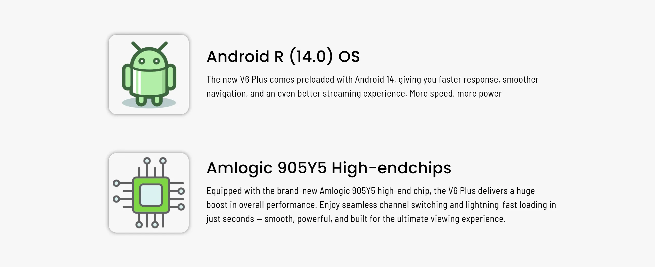 Equipped with the Amlogic S905Y5 high-end Quad-core chipset with ARM Cortex-A55 architecture, offering faster processing and improved efficiency.
