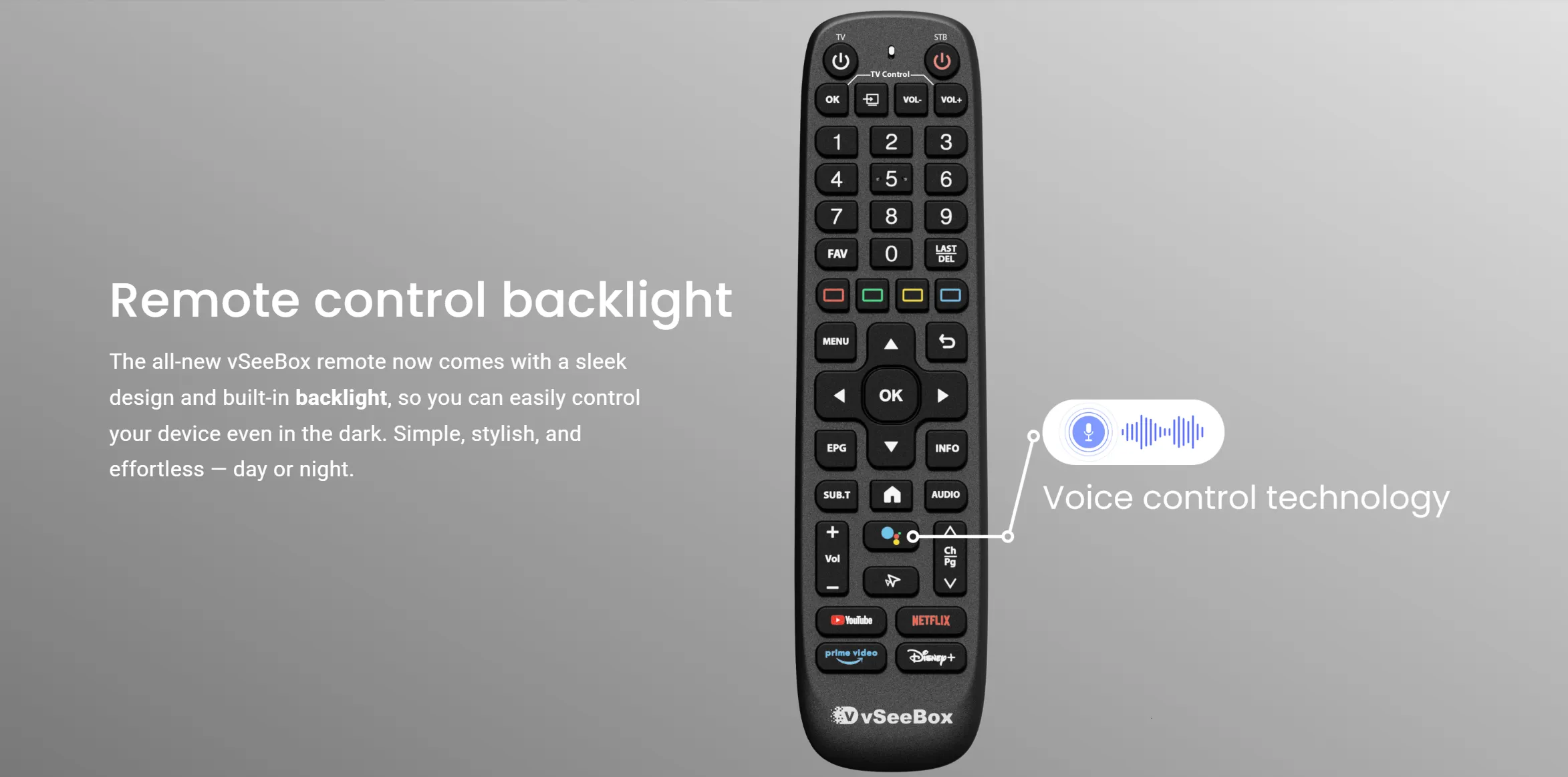 Comes with a newly designed backlit Bluetooth remote control for easy navigation in dark environments.